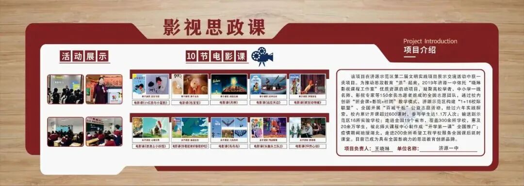 项目介绍:济源一中积极响应新时代思政教育改革创新号召,2019年启动影视思政课文明实践项目,项目依托晓琳影视课程工作室优质资源,组建150人全国志愿者团队。校内创新班会课+影院+社团教学模式,济源示范区构建1+16校际联盟,在教育部支持下全国开展百城千校公益志愿活动,获教育厅官网推广。